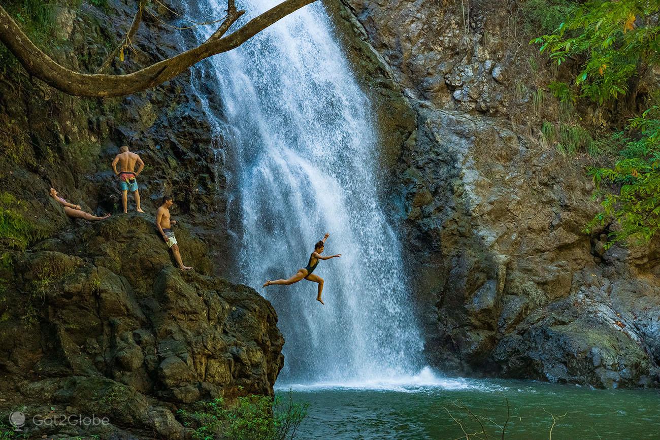 Sin embargo, hay una plataforma de roca natural formada justo detrás de la cortina de la cascada, no es tan alta y saltas desde ahí atravesando la cascada hacia la piscina. Hay un amplio espacio al lado de la piscina para sentarse, relajarse y tomar un refrigerio rápido después de nadar.